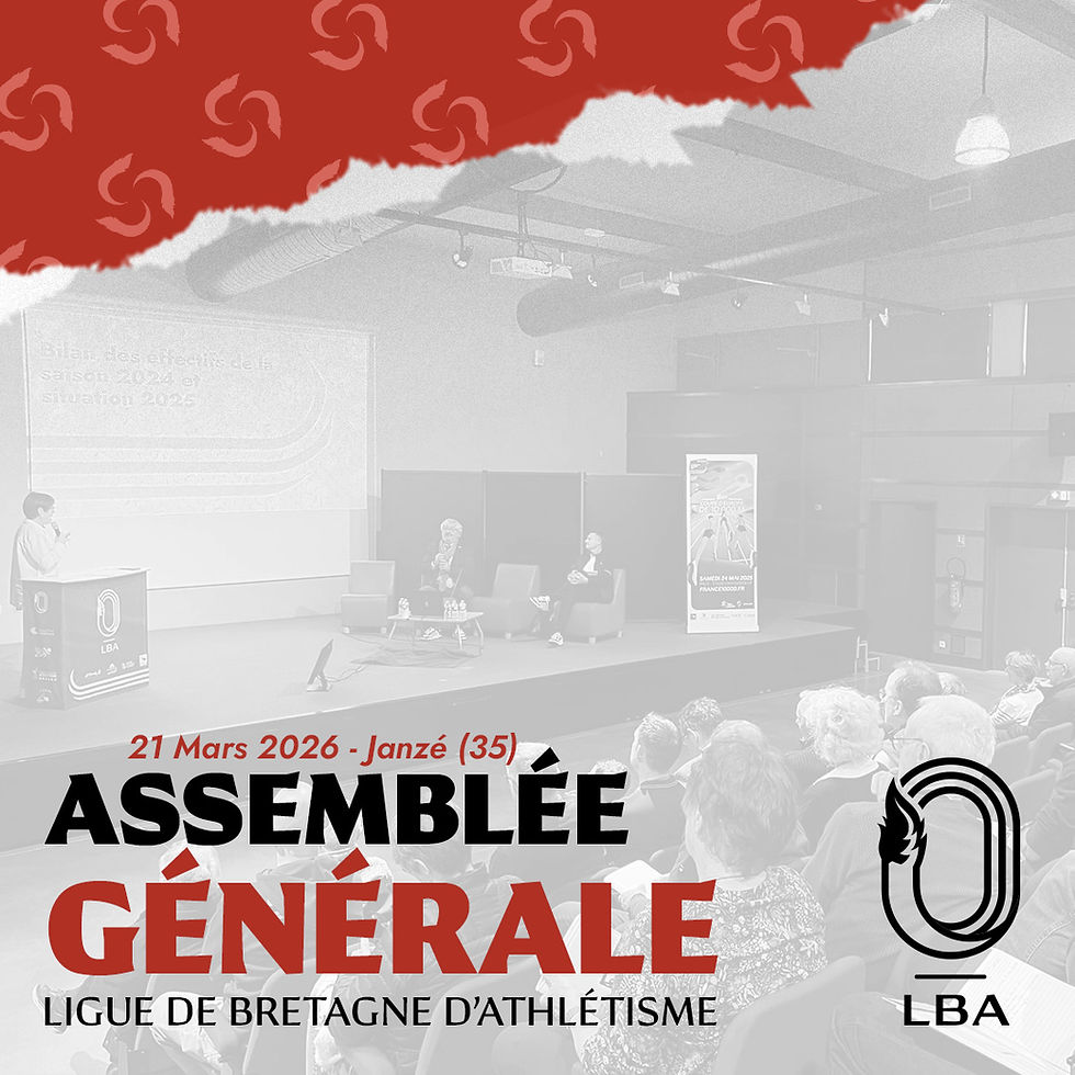 Le Samedi 21 Mars 2026 de 14h30 à 18h00 se déroulera l'assemblée générale de la Ligue de Bretagne d'Athlétisme dans la salle Le Gentieg - 8 Allée de l'Yve, 35150 Janzé
